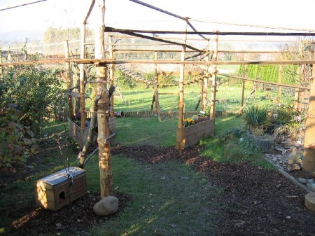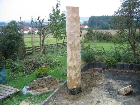 Grundgerüst des gesamten Gartens sind also 3 Meter hohe Zaunpfosten, die mit handelsüblichen Schlaghülsen in die Erde eingelassen sind. Im Innenraum sind zusätzlich 10 Lärchenstämme und eine zufällig zum günstigen Zeitpunkt gefällte Kiefer in Beton eingelassen. Alle Naturhölzer haben wir vor dem Bau im mühevoller Handarbeit geschält. Die Stämme dienen natürlich als Klettermöglichkeiten für die Katzen, aber auch als Trägerkonstruktion für das Netz.