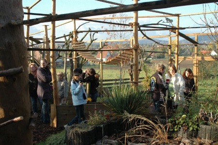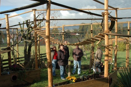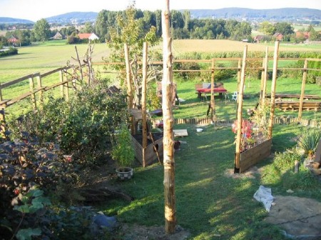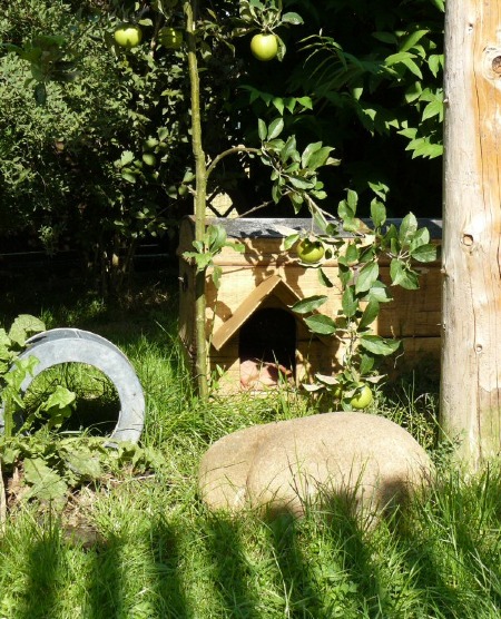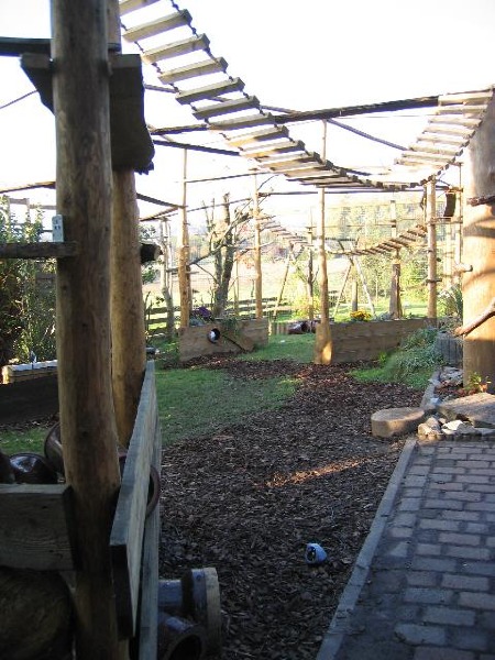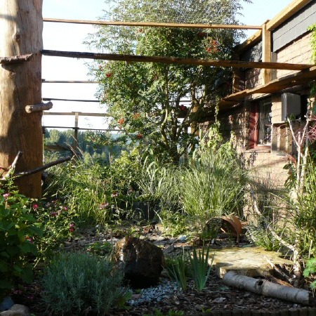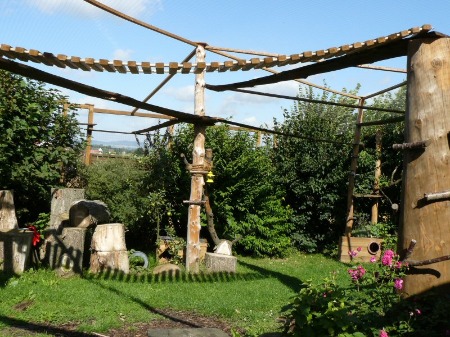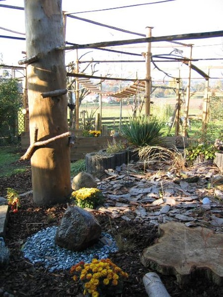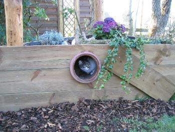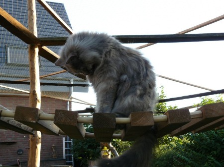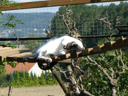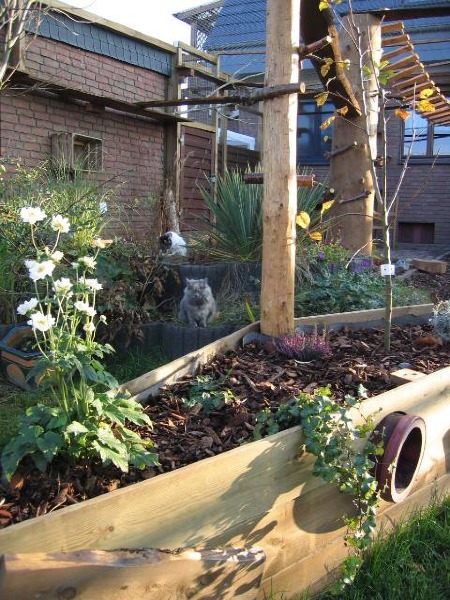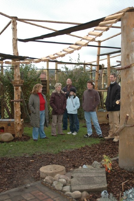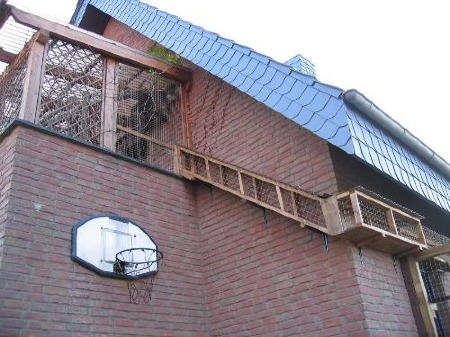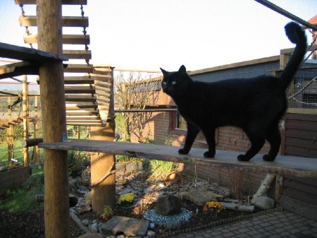 Um unseren geliebten Vierbeinern den Aufenthalt in Ihrem ‚Gefängnis’ so angenehm wie möglich zu gestalten, haben wir den gesamten Garten so angelegt, daß er dreidimensional genutzt werden kann. Das bedeutet, daß die komplette äußere Begrenzung durch einen in ca. 2,5 Meter Höhe befindlichen ‚Laufsteg’ abgewandert werden kann, der auch die inneren Elemente auf unterschiedlichen Höhen verbindet. Außerdem haben wir Blumenbeete, Leiterkonstruktionen und diverse Tunnelsysteme eingebaut, um ausreichende Spiel- und Beschäftigungsmöglichkeiten für unsere Samtpfoten zu schaffen. Der Phantasie sind da keine Grenzen gesetzt…
