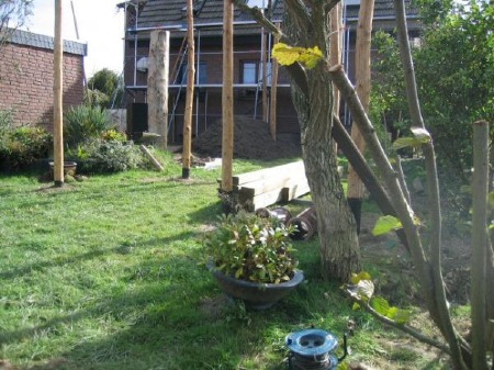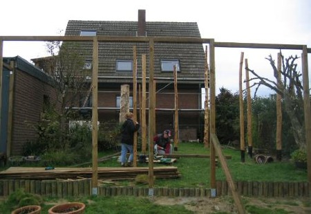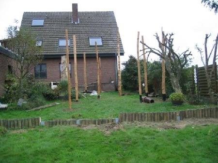 Zunächst war es nur eine vage Idee, aber die Pläne wurden schnell konkreter. Wir überlegten, wie wir bereits vorhandene Elemente in unseren Katzengarten einbinden konnten: So schließt der Garten zur linken Seiten mit Flechtzaunelementen ab, die bereits vorhanden waren und nur insofern verändert wurden, daß die alten 2 Meter hohen Pfosten durch höhere ausgetauscht wurden. Zur rechten Seite wurde die Wand unserer Garage zur Begrenzung. Die obere Seite des Katzengartens wird durch unsere Hauswand begrenzt.